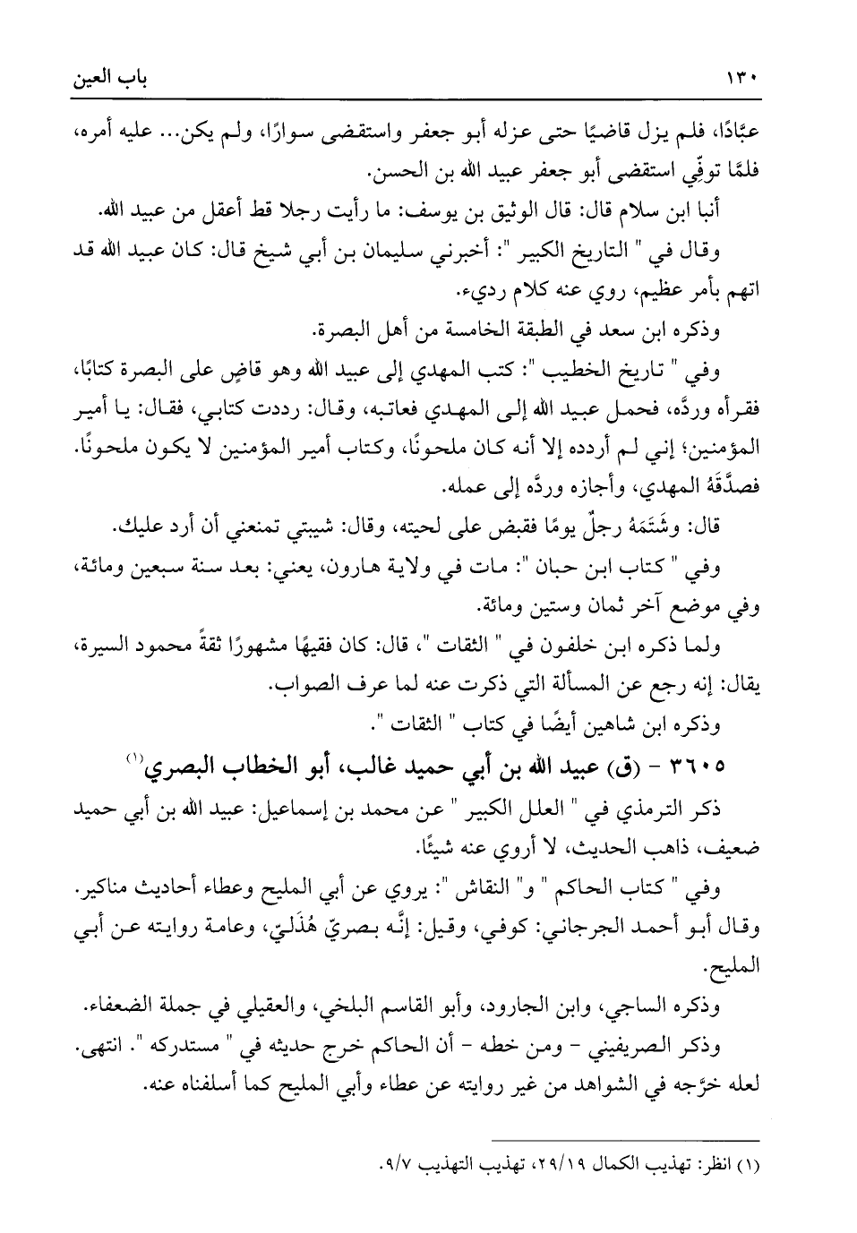 وفي "تاريخ الخطيب": كتب المهدي إلى عبيد اللَّه وهو قاضٍ على البصرة كتابًا، فقرأه وردَّه، فحمل عبيد اللَّه إلى المهدي فعاتبه، وقال: رددت كتابي، فقال: يا أمير المؤمنين؛ إني لم أردده إلا أنه كان ملحونًا، وكتاب أمير المؤمنين لا يكون ملحونًا. فصدَّقَهُ المهدي، وأجازه وردَّه إلى عمله.
