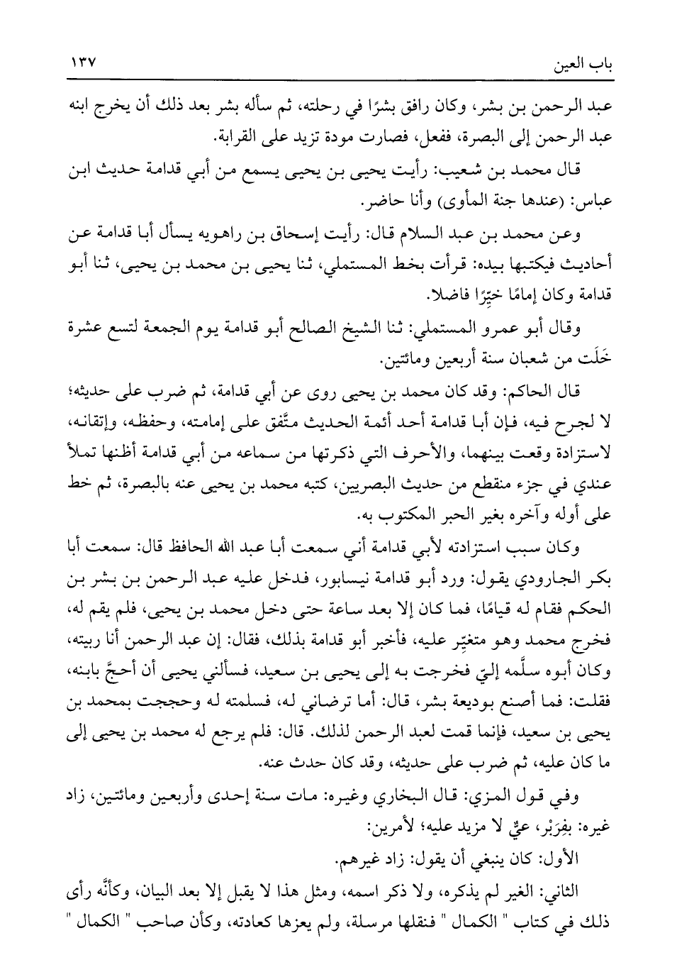 وكان سبب استزادته لأبي قدامة أني سمعت أبا عبد اللَّه الحافظ قال: سمعت أبا بكر الجارودي يقول: ورد أبو قدامة نيسابور، فدخل عليه عبد الرحمن بن بشر بن الحكم فقام له قيامًا، فما كان إلا بعد ساعة حتى دخل محمد بن يحيى، فلم يقم له، فخرج محمد وهو متغيِّر عليه، فأخبر أبو قدامة بذلك، فقال: إن عبد الرحمن أنا ربيته، وكان أبوه سلَّمه إليّ فخرجت به إلى يحيى بن سعيد، فسألني يحيى أن أحجَّ بابنه، فقلت: فما أصنع بوديعة بشر، قال: أما ترضاني له، فسلمته له وحججت بمحمد بن يحيى بن سعيد، فإنما قمت لعبد الرحمن لذلك. قال: فلم يرجع له محمد بن يحيى إلى ما كان عليه، ثم ضرب على حديثه، وقد كان حدث عنه.