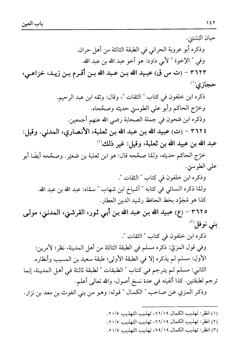 ٣٦٢٤ - (ت) عبيد اللَّه بن عبد اللَّه بن ثعلبة، الأنصاري، المدني. وقيل: عبد اللَّه بن عبيد اللَّه بن ثعلبة، وقيل: غير ذلك (¬٢)