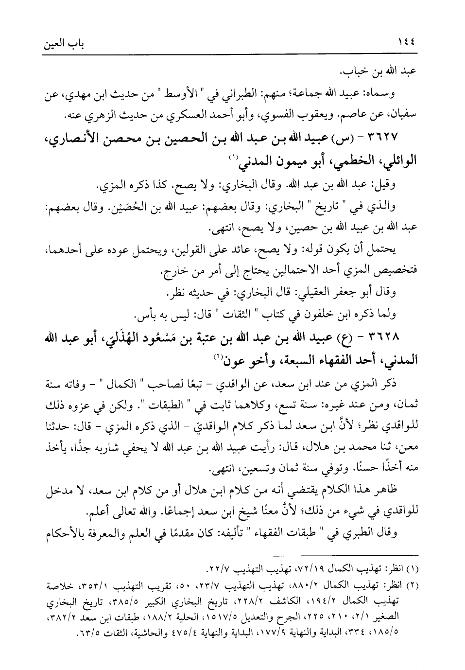 ٣٦٢٧ - (س) عبيد اللَّه بن عبد اللَّه بن الحصين بن محصن الأنصاري، الوائلي، الخطمي، أبو ميمون المدني (¬١)