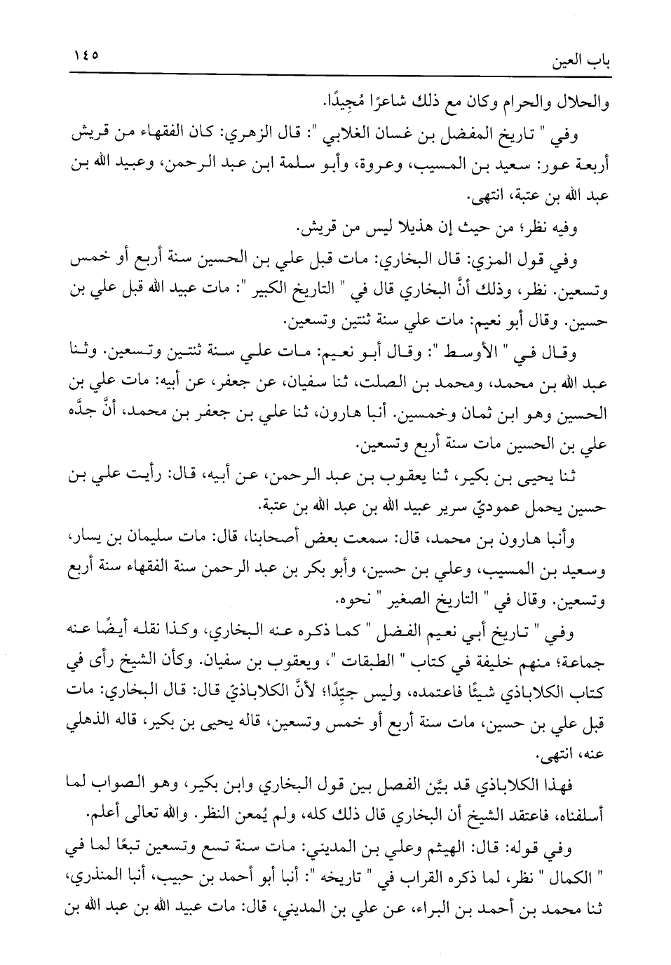 وفي "تاريخ أبي نعيم الفضل" كما ذكره عنه البخاري، وكذا نقله أيضًا عنه جماعة؛ منهم خليفة في كتاب "الطبقات"، ويعقوب بن سفيان. وكأن الشيخ رأى في كتاب الكلاباذي شيئًا فاعتمده، وليس جيِّدًا؛ لأنَّ الكلاباذيّ قال: قال البخاري: مات قبل علي بن حسين، مات سنة أربع أو خمس وتسعين، قاله يحيى بن بكير، قاله الذهلي عنه، انتهى.