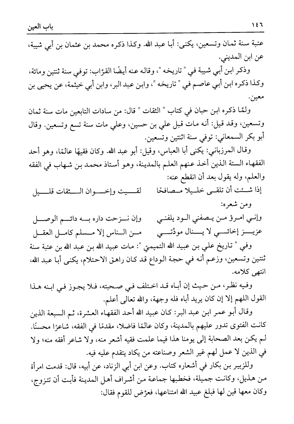 وقال المرزباني: يكنى أبا العباس، وقيل: أبو عبد اللَّه. وكان فقيهًا عالمًا، وهو أحد الفقهاء الستة الذين أخذ عنهم العلم بالمدينة، وهو أستاذ محمد بن شهاب في الفقه والعلم، وله يقول بعد أن انقطع عنه:
