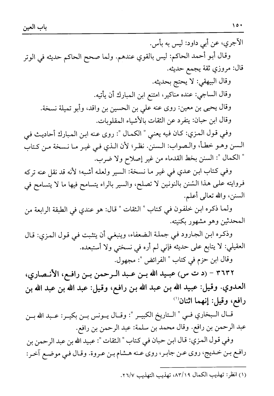 وفي قول المزي: قال ابن حبان في كتاب "الثقات": عبيد اللَّه بن عبد الرحمن بن رافع بن خديج، روى عن جابر، روى عنه هشام بن عروة. وقال في موضع آخر: