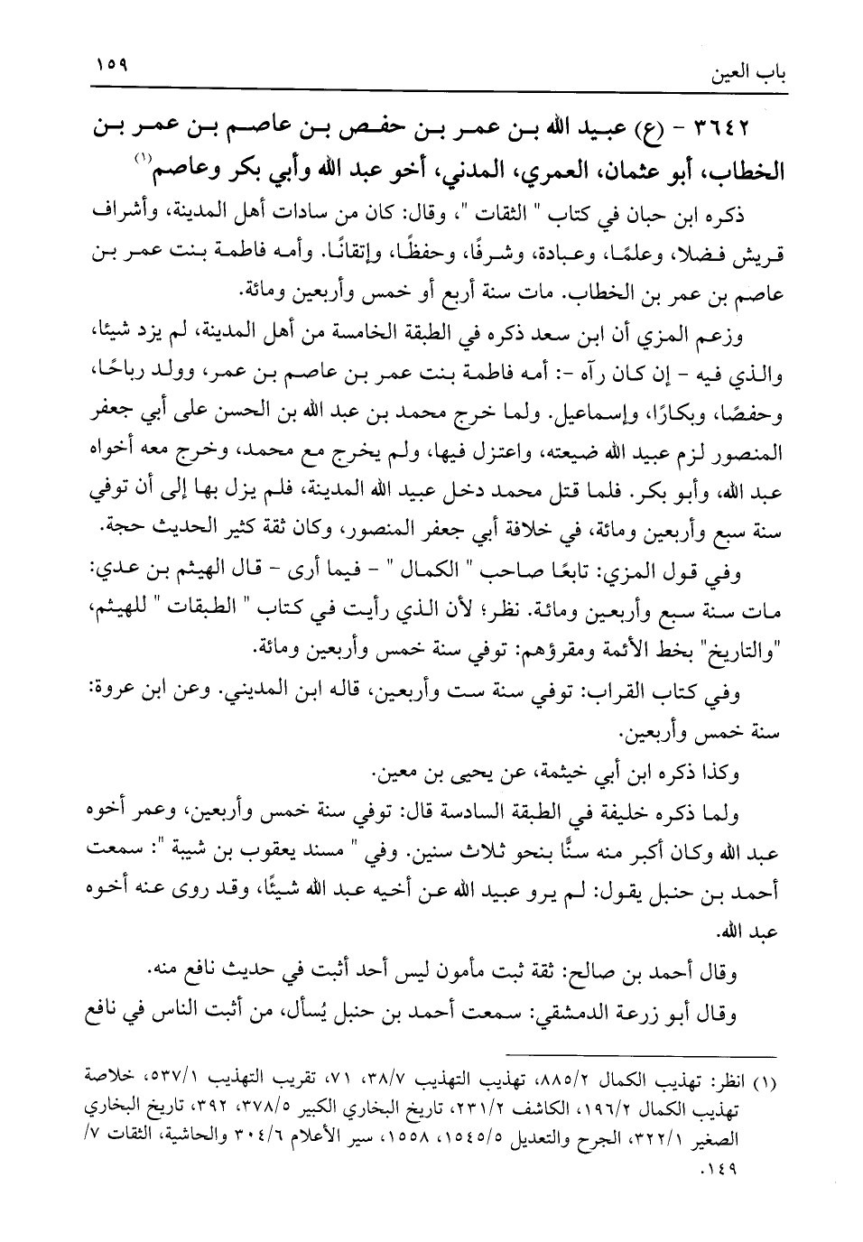 (¬١) انظر: تهذيب الكمال ٢/ ٨٨٥، تهذيب التهذيب ٧/ ٣٨، ٧١، تقريب التهذيب ١/ ٥٣٧، خلاصة تهذيب الكمال ٢/ ١٩٦، الكاشف ٢/ ٢٣١، تاريخ البخاري الكبير ٥/ ٣٧٨، ٣٩٢، تاريخ البخاري الصغير ١/ ٣٢٢، الجرح والتعديل ٥/ ١٥٤٥، ١٥٥٨، سير الأعلام ٦/ ٣٠٤ والحاشية، الثقات ٧/ ١٤٩.