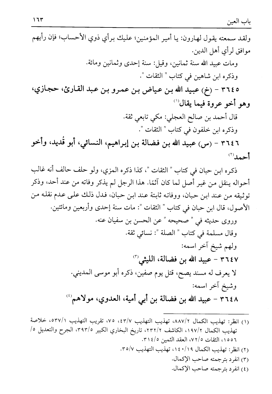 (¬١) انظر: تهذيب الكمال ٢/ ٨٨٧، تهذيب التهذيب ٧/ ٤٣، ٧٥، تقريب التهذيب ١/ ٥٣٧، خلاصة تهذيب الكمال ٢/ ١٩٧، الكاشف ٢/ ٢٣٢، تاريخ البخاري الكبير ٥/ ٣٩٣، الجرح والتعديل ٥/ ١٥٥٦، الثقات ٥/ ٧٢، العقد الثمين ٥/ ٣١٤.