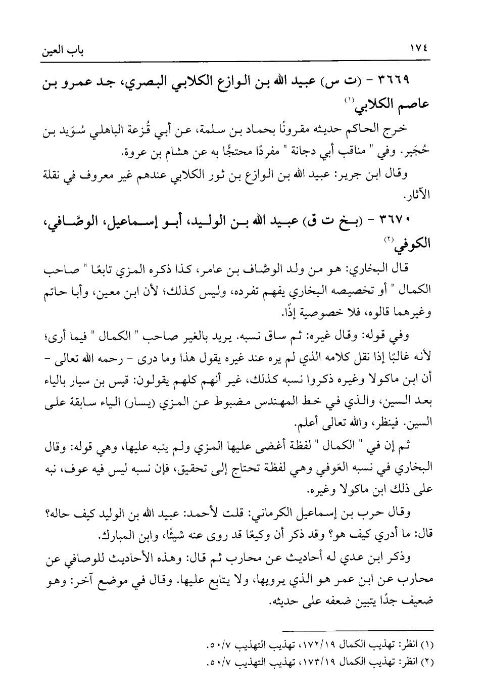 ثم إن في "الكمال" لفظة أغضى عليها المزي ولم ينبه عليها، وهي قوله: وقال البخاري في نسبه العَوفي وهي لفظة تحتاج إلى تحقيق، فإن نسبه ليس فيه عوف، نبه على ذلك ابن ماكولا وغيره.