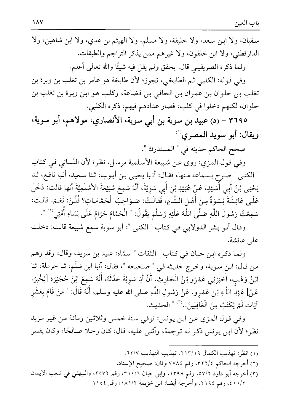 وفي قول المزي: روى عن سُبيعة الأسلمية مرسل، نظر؛ لأن النَّسائي في كتاب "الكنى" صرح بسماعه منها، فقال: أنبا يحيى بن أيوب، ثنا سعيد، أنبا نافع، ثنا يَحْيَى بْنُ أَبِي أُسَيْدٍ، عَنْ عُبَيْدِ بْنِ أَبِي سَوِيَّةَ، أَنَّهُ سَمِعَ سُبَيْعَةَ الأسْلَمِيَّةَ أنها قالت: دَخَلَ عَلَى عَائِشَةَ نِسْوَةٌ مِنْ أَهْلِ الشَّامِ، فَقَالَتْ: صَوَاحِبُ الْحَمَّامَاتِ؛ قُلْنَ: نَعَمْ. قالت: سَمِعْتُ رَسُولَ اللَّهِ صَلَّى اللَّهُ عَلَيْهِ وَسَلَّمَ يَقُولُ: "الْحَمَّامُ حَرَامٌ عَلَى نِسَاءِ أُمَّتِي (¬٢) ".