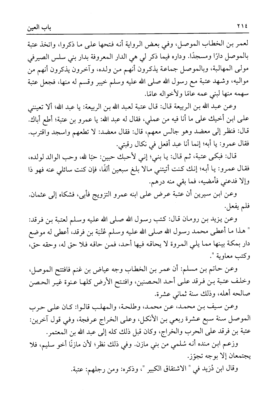 لعمر بن الخطاب الموصل، وفي بعض الرواية أنه فتحها على ما ذكروا، واتخذ عتبة بالموصل دارًا ومسجدًا. وداره فيما ذكر لي هي الدار المعروفة بدار بني سلس الصيرفي مولى المهالبة، وبالموصل جماعة يذكرون أنهم من ولده، وآخرون يذكرون أنهم من مواليه، وشهد عتبة مع رسول اللَّه صلى اللَّه عليه وسلم خيبر وقسم له منها، فجعل عتبة سهمه منها لبني عمه عامًا ولأخواله عامًا.