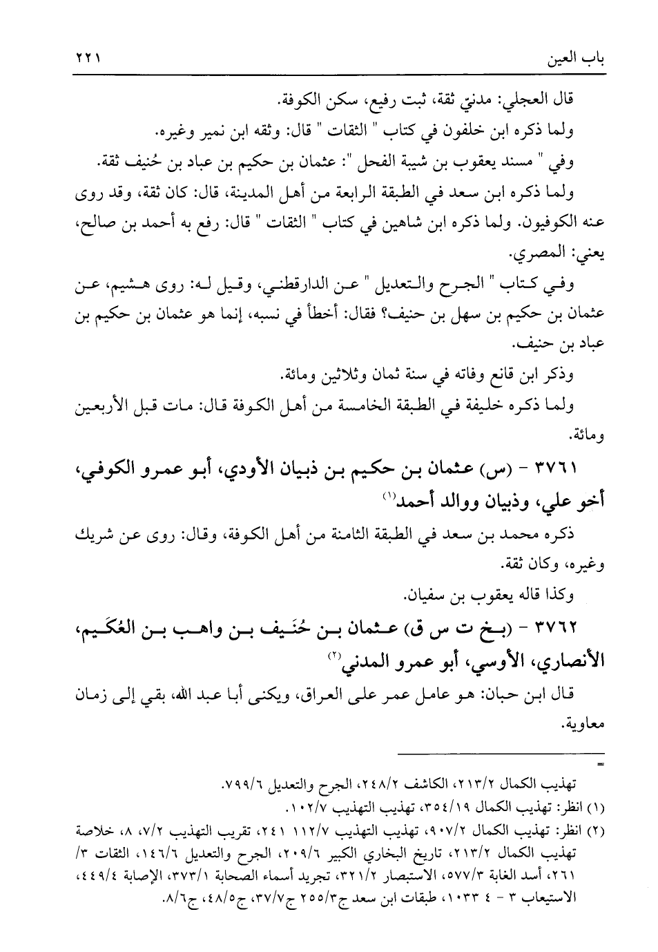 ٣٧٦٢ - (بخ ت س ق) عثمان بن حُنَيف بن واهب بن العُكَيم، الأنصاري، الأوسي، أبو عمرو المدني (¬٢)