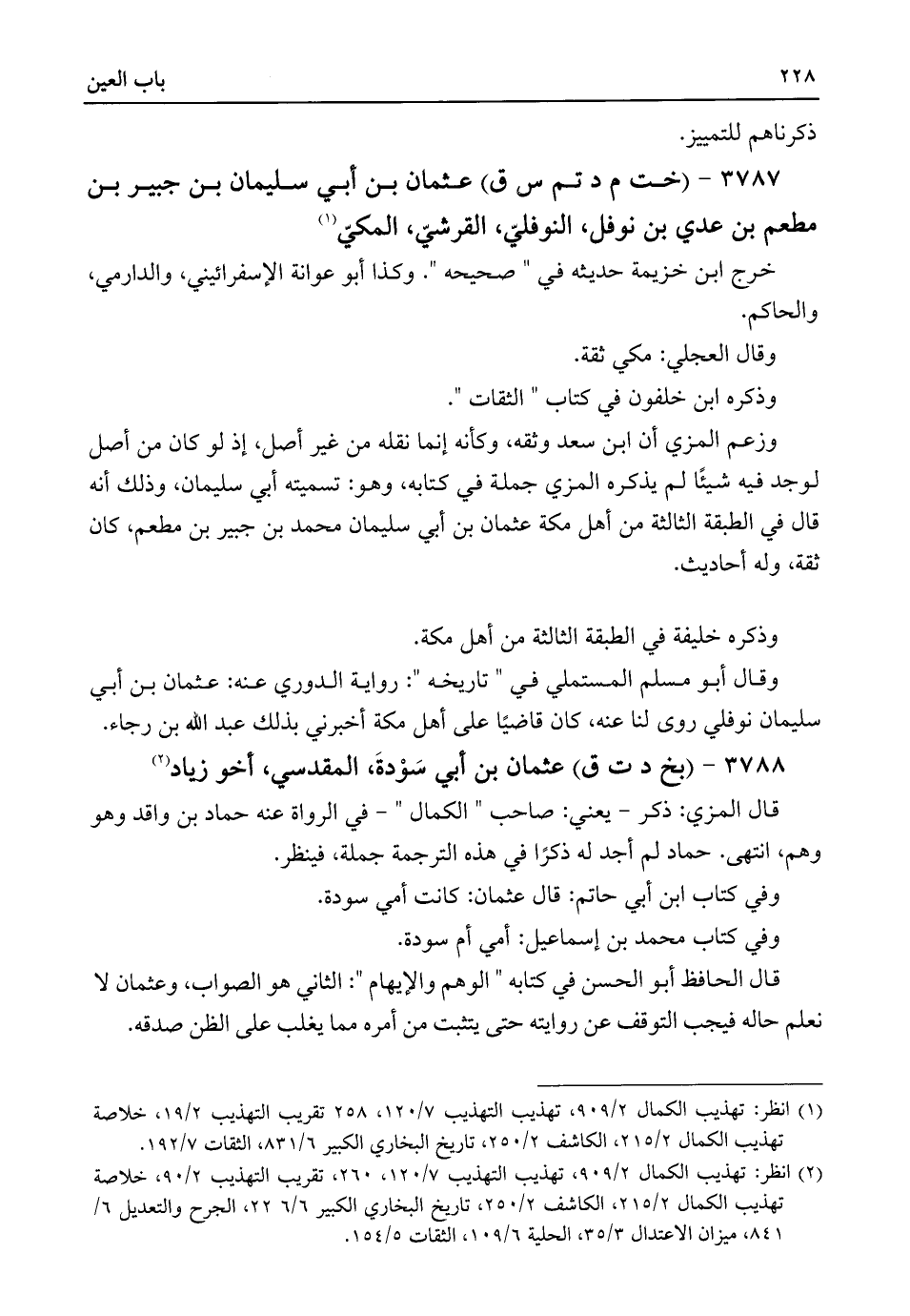 وزعم المزي أن ابن سعد وثقه، وكأنه إنما نقله من غير أصل، إذ لو كان من أصل لوجد فيه شيئًا لم يذكره المزي جملة في كتابه، وهو: تسميته أبي سليمان، وذلك أنه قال في الطبقة الثالثة من أهل مكة عثمان بن أبي سليمان محمد بن جبير بن مطعم، كان ثقة، وله أحاديث.