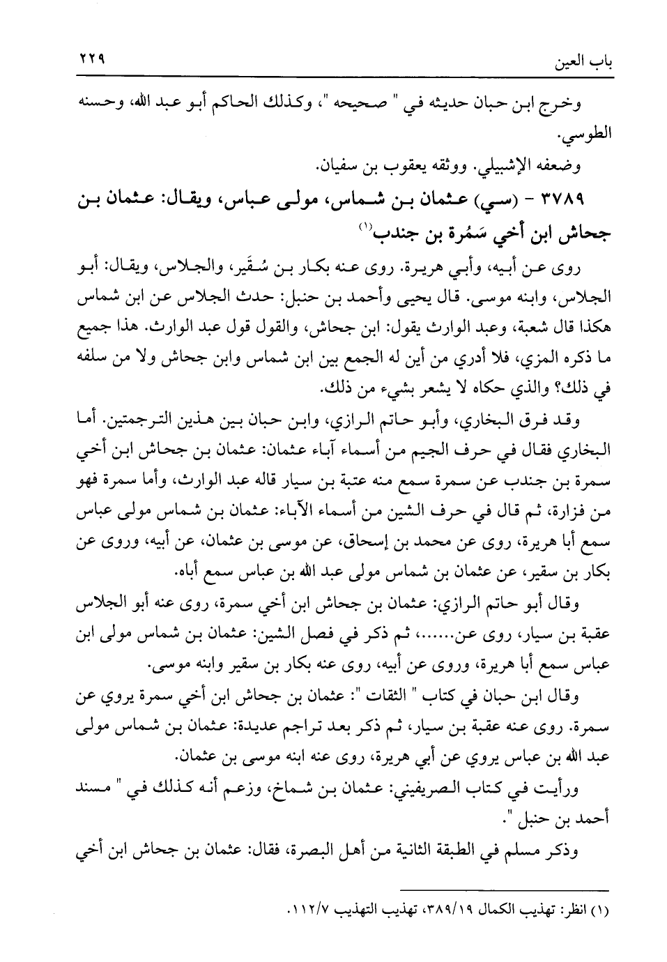 وقال ابن حبان في كتاب "الثقات": عثمان بن جحاش ابن أخي سمرة يروي عن سمرة. روى عنه عقبة بن سيار، ثم ذكر بعد تراجم عديدة: عثمان بن شماس مولى عبد اللَّه بن عباس يروي عن أبي هريرة، روى عنه ابنه موسى بن عثمان.