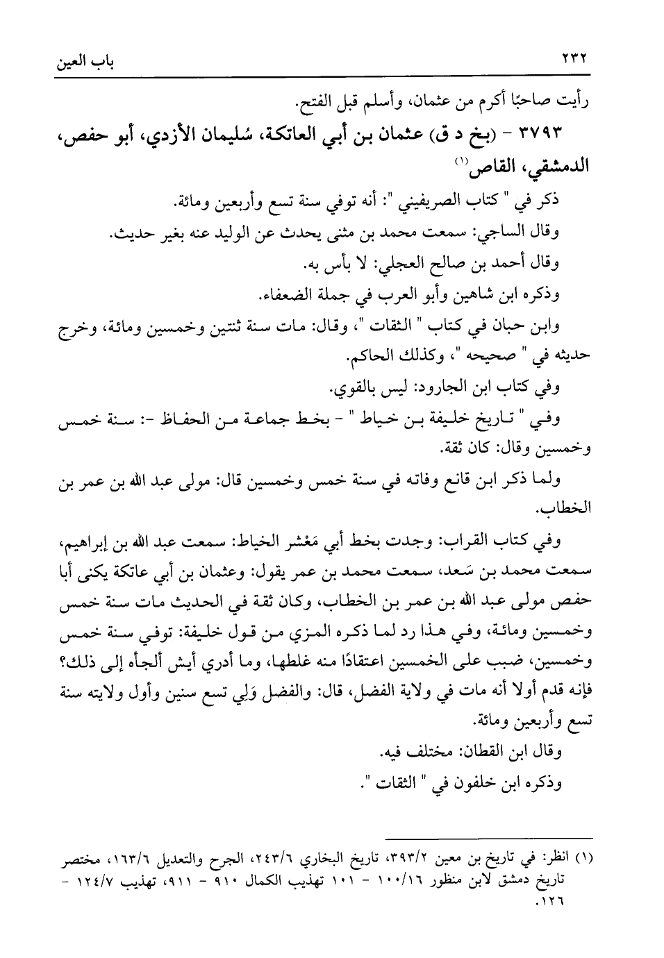 ٣٧٩٣ - (بخ د ق) عثمان بن أبي العاتكة، سُليمان الأزدي، أبو حفص، الدمشقي، القاص (¬١)