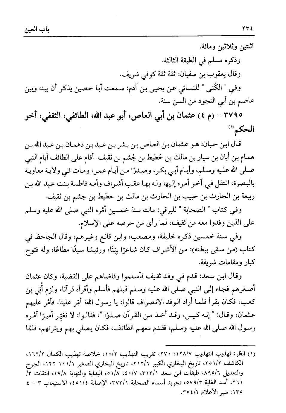 ٣٧٩٥ - (م ٤) عثمان بن أبي العاص، أبو عبد اللَّه، الطائفي، الثقفي، أخو الحكم (¬١)