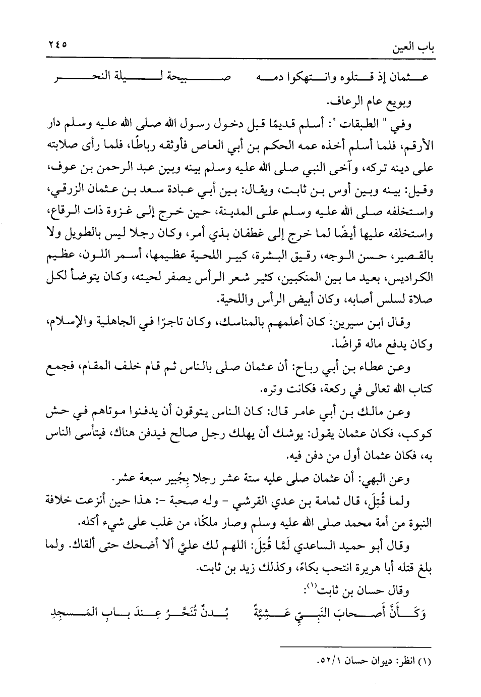 وفي "الطبقات": أسلم قديمًا قبل دخول رسول اللَّه صلى اللَّه عليه وسلم دار الأرقم، فلما أسلم أخذه عمه الحكم بن أبي العاص فأوثقه رباطًا، فلما رأى صلابته على دينه تركه، وآخى النبي صلى اللَّه عليه وسلم بينه وبين عبد الرحمن بن عوف، وقيل: بينه وبين أوس بن ثابت، ويقال: بين أبي عبادة سعد بن عثمان الزرقي، واستخلفه صلى اللَّه عليه وسلم على المدينة، حين خرج إلى غزوة ذات الرقاع، واستخلفه عليها أيضًا لما خرج إلى غطفان بذي أمر، وكان رجلا ليس بالطويل ولا بالقصير، حسن الوجه، رقيق البشرة، كبير اللحية عظيمها، أسمر اللون، عظيم الكراديس، بعيد ما بين المنكبين، كثير شعر الرأس يصفر لحيته، وكان يتوضأ لكل صلاة لسلس أصابه، وكان أبيض الرأس واللحية.