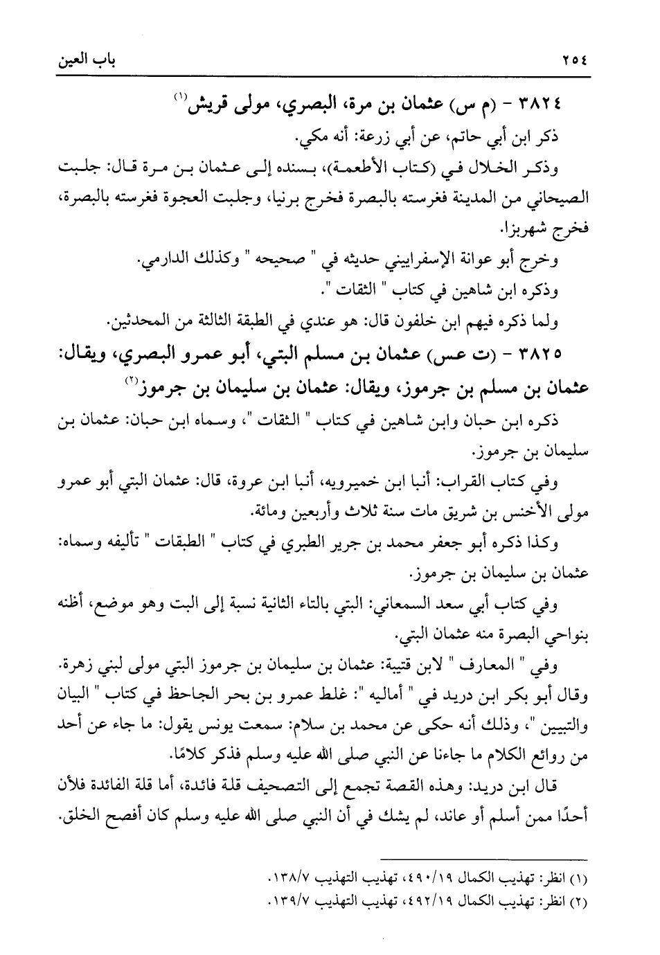 ٣٨٢٥ - (ت عس) عثمان بن مسلم البتي، أبو عمرو البصري، ويقال: عثمان بن مسلم بن جرموز، ويقال: عثمان بن سليمان بن جرموز (¬٢)