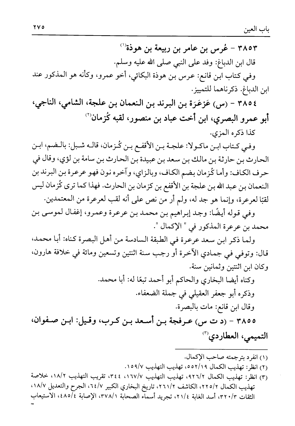 وفي كتاب ابن ماكولا: علجة بن الأقفع بن كُزمان، قاله شبل: بالضم، ابن الحارث بن حارثة بن مالك بن سعد بن عبيدة بن الحارث بن سامة بن لؤي، وقال في حرف الكاف: وأما كُزمان بضم الكاف، وبالزاي، وآخره نون فهو عرعرة بن البرند بن النعمان بن عبد اللَّه بن علجة بن الأقفع بن كزمان بن الحارث. فهذا كما ترى كُزمان يى لقبًا لعرعرة، وإنما هو جد له، ولم أر من نص على أنه لقب لعرعرة من المعتمدين.