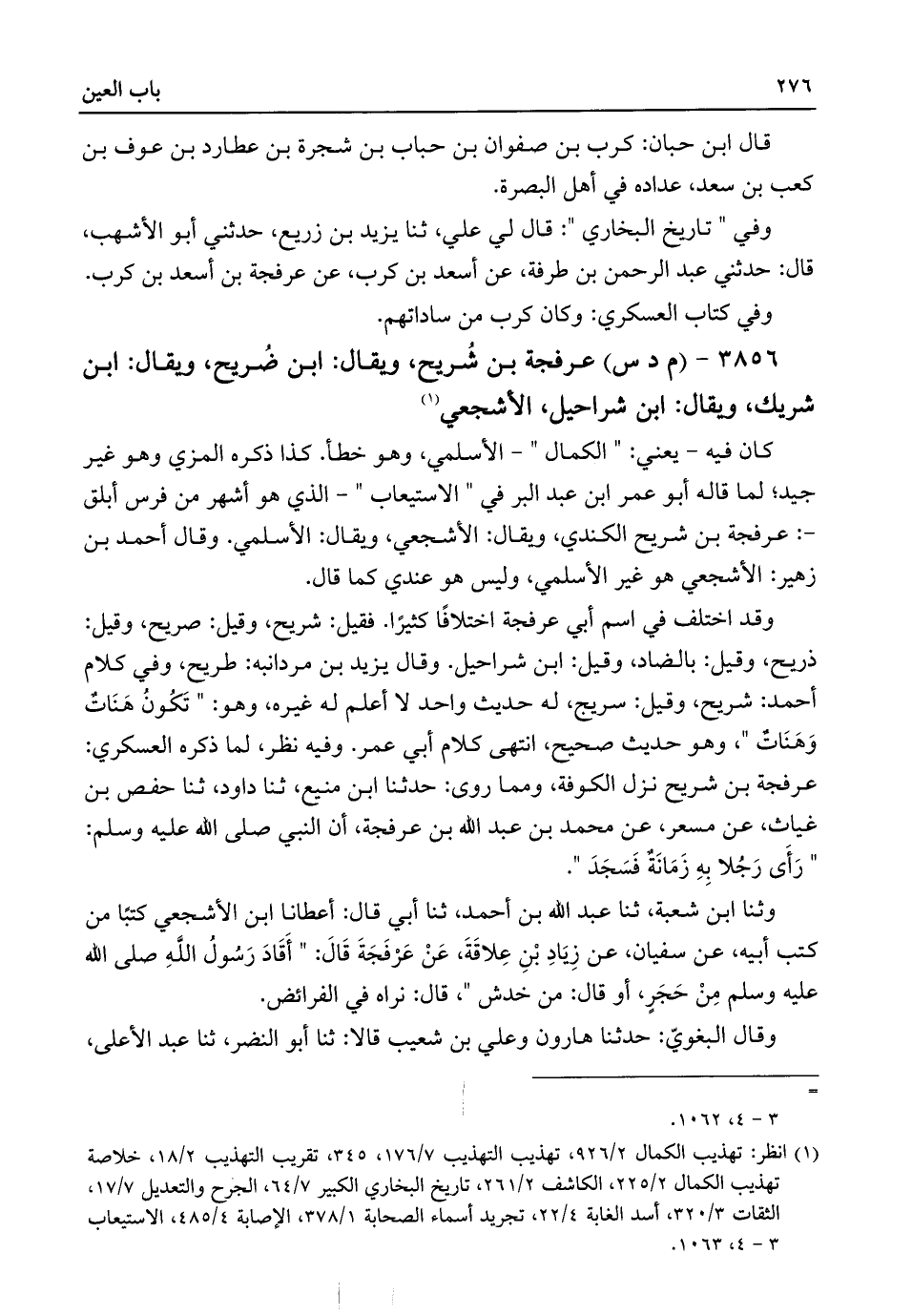 وفي "تاريخ البخاري": قال لي علي، ثنا يزيد بن زريع، حدثني أبو الأشهب، قال: حدثني عبد الرحمن بن طرفة، عن أسعد بن كرب، عن عرفجة بن أسعد بن كرب.