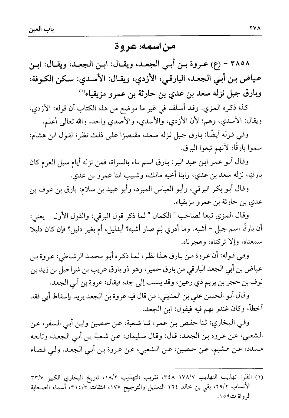 ٣٨٥٨ - (ع) عروة بن أبي الجعد، ويقال: ابن الجعد، ويقال: ابن عياض بن أبي الجعد، البارقي، الأزدي، ويقال: الأسدي: سكن الكوفة، وبارق جبل نزله سعد بن عدي بن حارثة بن عمرو مزيقياء (¬١)
