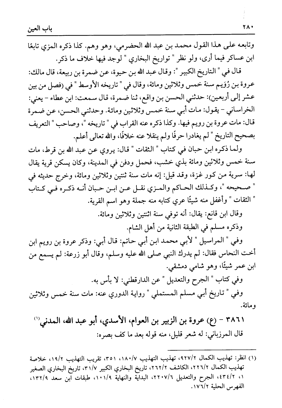 قال في "التاريخ الكبير": وقال عبد اللَّه بن حيوة، عن ضمرة بن ربيعة، قال مالك: عروة بن رُوَيم سنة خمس وثلاثين ومائة، وقال في "تاريخ الأوسط" في (فصل من بين عشر إلى أربعين): حدثني الحسن بن واقع، ثنا ضمرة، قال سمعت: ابن عطاء -يعني: الخراساني- يقول: مات أبي سنة خمس وثلاثين ومائة. وحدثني الحسن، عن ضمرة قال: مات عروة بن رويم فيها. وكذا ذكره عنه القراب في "تاريخه"، وصاحب "التعريف بصحيح التاريخ" لم يغادرا حرفًا ولم ينقلا عنه خلافًا، واللَّه تعالى أعلم.