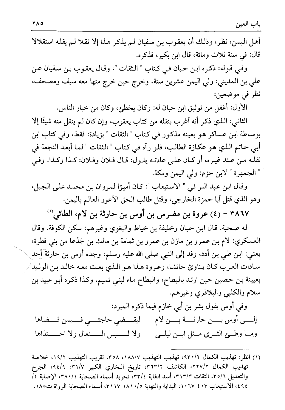 الثاني: الذي ذكر أنه أغرب بنقله من كتاب يعقوب، وإن كان لم ينقل منه شيئًا إلا بوساطة ابن عساكر هو بعينه مذكور في كتاب "الثقات" بزيادة: فقط، وفي كتاب ابن أبي حاتم الذي هو عكازة الطالب، فلو رآه في كتاب "الثقات" لما أبعد النجعة في نقله من عند غيره، أو كان على عادته يقول: قال فلان وفلان: كذا وكذا. وفي "الجمهرة" لابن حزم: ولي اليمن ومكة.