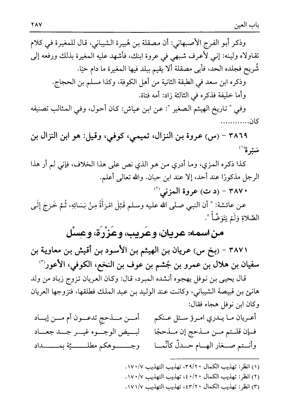 ٣٨٦٩ - (س) عروة بن النزال، تميمي، كوفي، وقيل: هو ابن النزال بن سَبْرة (¬١)