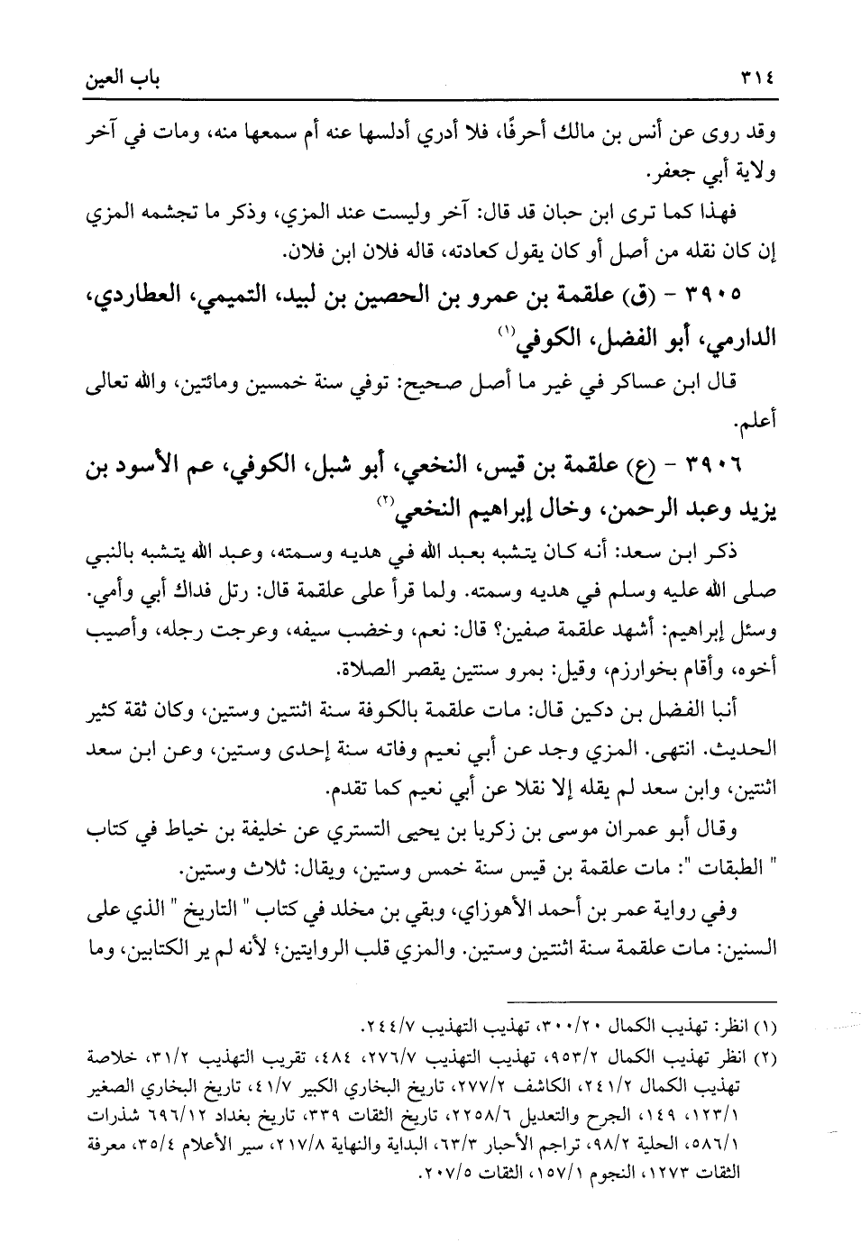 أنبا الفضل بن دكين قال: مات علقمة بالكوفة سنة اثنتين وستين، وكان ثقة كثير الحديث. انتهى. المزي وجد عن أبي نعيم وفاته سنة إحدى وستين، وعن ابن سعد اثنتين، وابن سعد لم يقله إلا نقلا عن أبي نعيم كما تقدم.