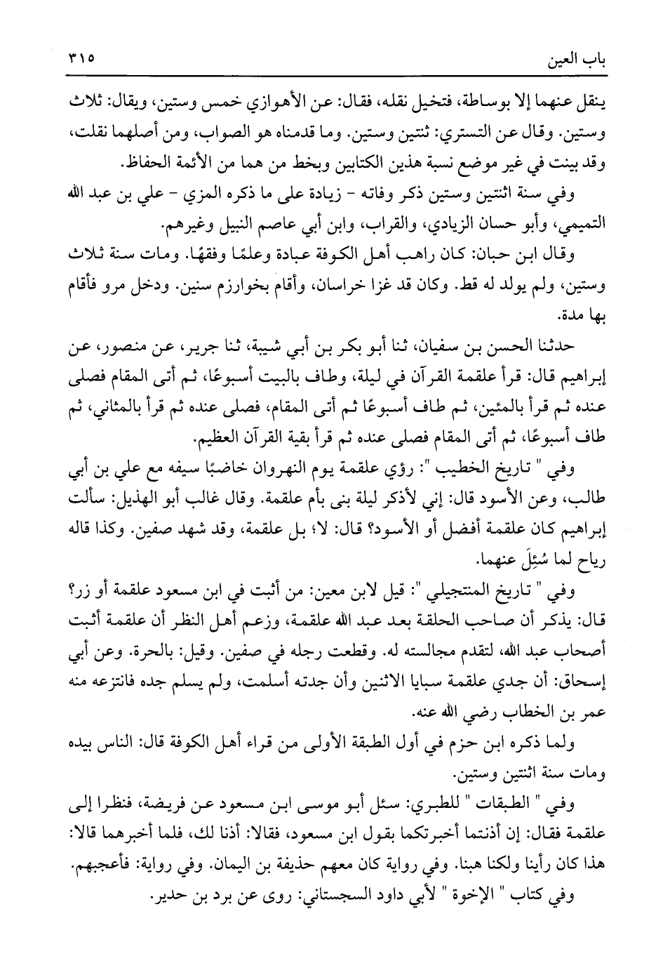 وفي "تاريخ المنتجيلي": قيل لابن معين: من أثبت في ابن مسعود علقمة أو زر؟ قال: يذكر أن صاحب الحلقة بعد عبد اللَّه علقمة، وزعم أهل النظر أن علقمة أثبت أصحاب عبد اللَّه، لتقدم مجالسته له. وقطعت رجله في صفين. وقيل: بالحرة. وعن أبي إسحاق: أن جدي علقمة سبايا الاثنين وأن جدته أسلمت، ولم يسلم جده فانتزعه منه عمر بن الخطاب رضي اللَّه عنه.