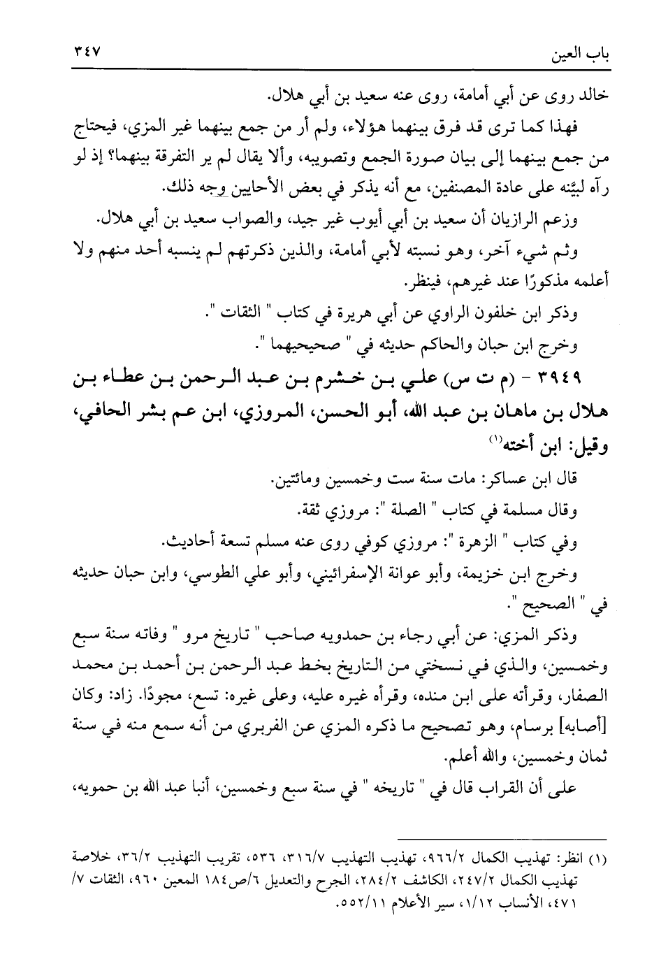 (¬١) انظر: تهذيب الكمال ٢/ ٩٦٦، تهذيب التهذيب ٧/ ٣١٦، ٥٣٦، تقريب التهذيب ٢/ ٣٦، خلاصة تهذيب الكمال ٢/ ٢٤٧، الكاشف ٢/ ٢٨٤، الجرح والتعديل ٦/ ص ١٨٤ المعين ٩٦٠، الثقات ٧/ ٤٧١، الأنساب ١٢/ ١، سير الأعلام ١١/ ٥٥٢.