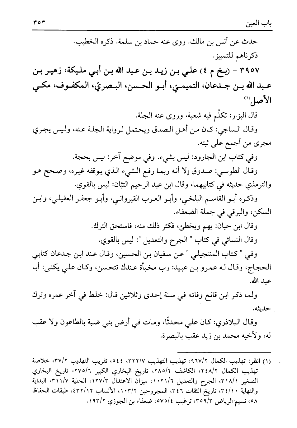 ٣٩٥٧ - (بخ م ٤) علي بن زيد بن عبد اللَّه بن أبي مليكة، زهير بن عبد اللَّه بن جدعان، التميميّ، أبو الحسن، البصريّ، المكفوف، مكي الأصل (¬١)