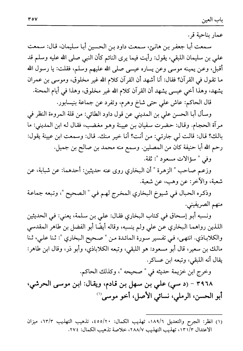 (¬١) انظر: الجرح والتعديل ٦/ ١٨٩، تهذيب الكمال: ٢٠/ ٤٥٥، تذهيب التهذيب ٣/ ٦٣، ميزان الاعتدال ٣/ ١٣١، تهذيب التهذيب ٧/ ٢٨٨، خلاصة تذهيب الكمال: ٢٧٤.