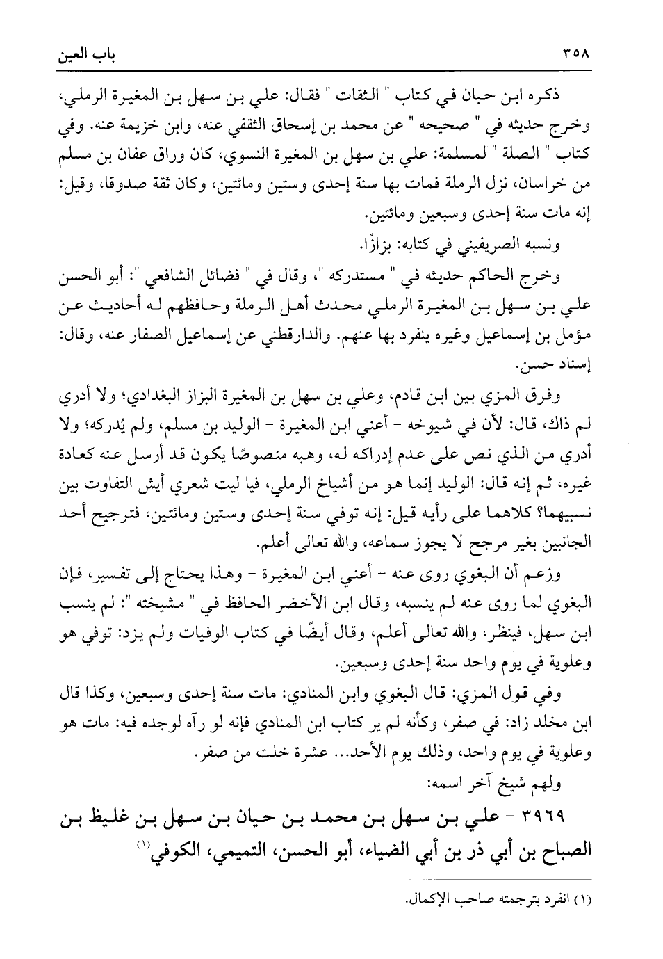 وزعم أن البغوي روى عنه -أعني ابن المغيرة- وهذا يحتاج إلى تفسير، فإن البغوي لما روى عنه لم ينسبه، وقال ابن الأخضر الحافظ في "مشيخته": لم ينسب ابن سهل، فينظر، واللَّه تعالى أعلم، وقال أيضًا في كتاب الوفيات ولم يزد: توفي هو وعلوية في يوم واحد سنة إحدى وسبعين.