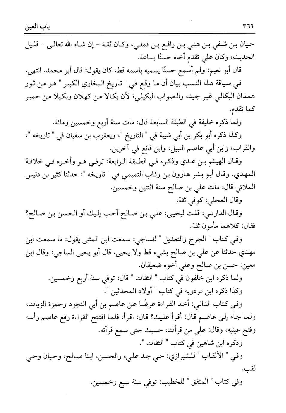 وفي "الألقاب" للشيرازي: حي جد علي، والحسن، ابنا صالح، وحيان وحي لقب.
