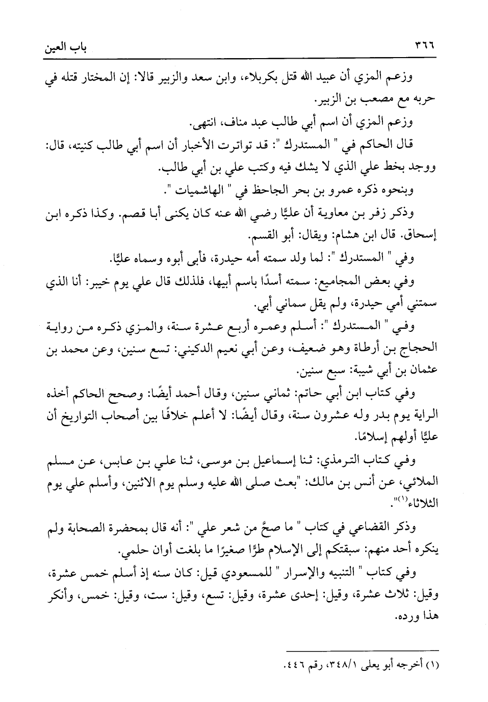 وفي كتاب ابن أبي حاتم: ثماني سنين، وقال أحمد أيضًا: وصحح الحاكم أخذه الراية يوم بدر وله عشرون سنة، وقال أيضًا: لا أعلم خلافًا بين أصحاب التواريخ أن عليًّا أولهم إسلامًا.