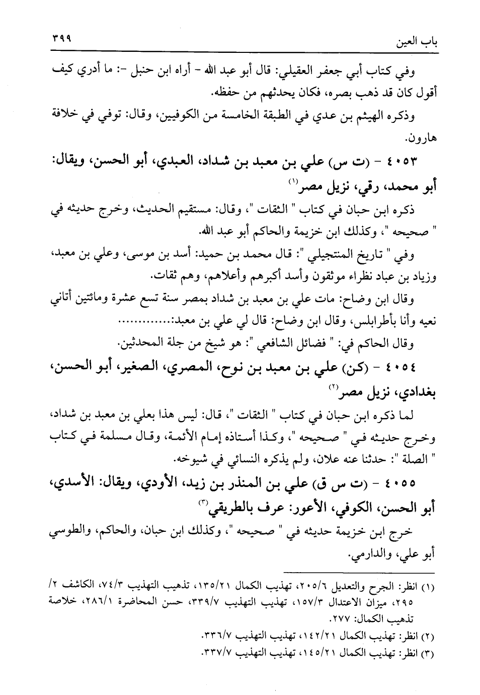 لما ذكره ابن حبان في كتاب "الثقات"، قال: ليس هذا بعلي بن معبد بن شداد، وخرج حديثه في "صحيحه"، وكذا أستاذه إمام الأئمة، وقال مسلمة في كتاب "الصلة": حدثنا عنه علان، ولم يذكره النسائي في شيوخه.