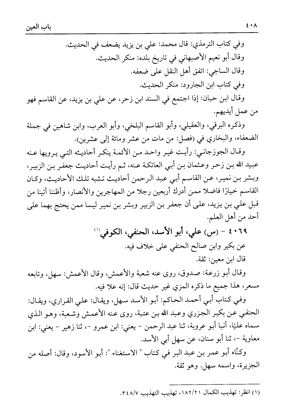 وفي كتاب أبي أحمد الحاكم: أبو الأسد سهل، ويقال: علي القراري، ويقال: الحنفي عن بكير الجزري وعبد اللَّه بن عتبة، روى عنه الأعمش وشعبة، وهو الذي سماه عليًا، أنبا أبو عروبة، ثنا عبد الرحمن -يعني: ابن عمرو-، ثنا زهير -يعني: ابن معاوية-، ثنا أبو سنان، عن سهل أبي الأسد.