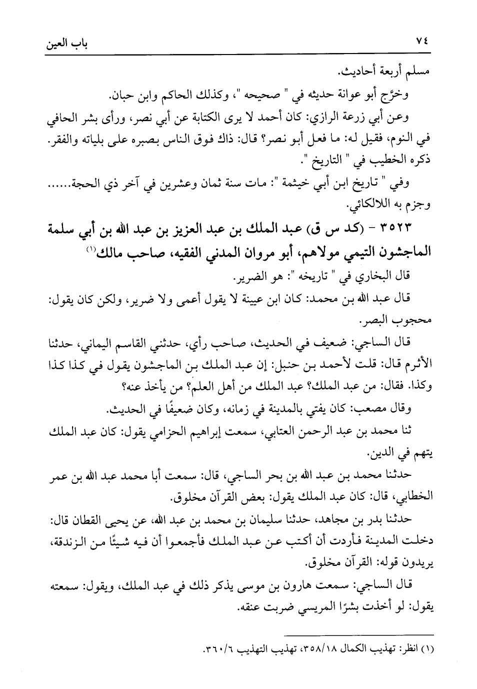 ٣٥٢٣ - (كد س ق) عبد الملك بن عبد العزيز بن عبد اللَّه بن أبي سلمة الماجشون التيمي مولاهم، أبو مروان المدني الفقيه، صاحب مالك (¬١)