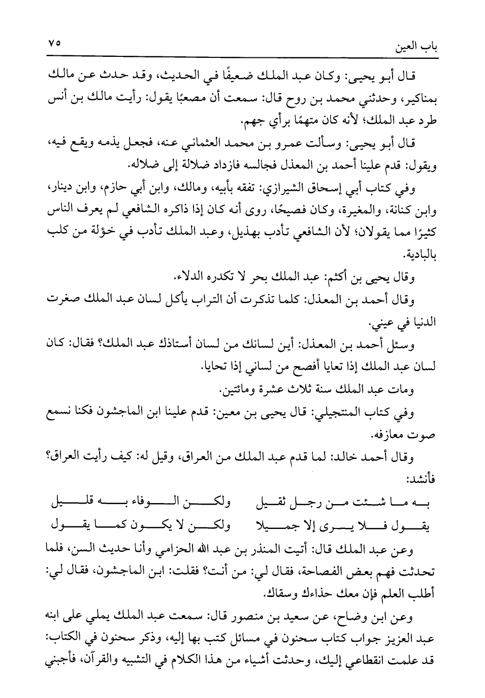 قال أبو يحيى: وكان عبد الملك ضعيفًا في الحديث، وقد حدث عن مالك بمناكير، وحدثني محمد بن روح قال: سمعت أن مصعبًا يقول: رأيت مالك بن أنس طرد عبد الملك؛ لأنه كان متهمًا برأي جهم.