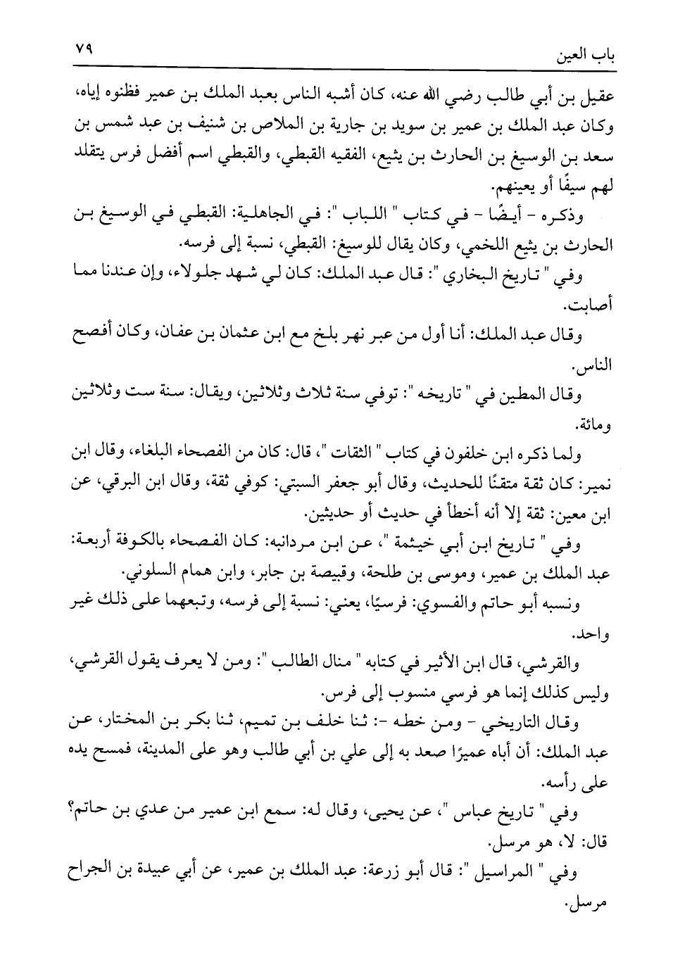 وقال التاريخي -ومن خطه-: ثنا خلف بن تميم، ثنا بكر بن المختار، عن عبد الملك: أن أباه عميرًا صعد به إلى علي بن أبي طالب وهو على المدينة، فمسح يده على رأسه.