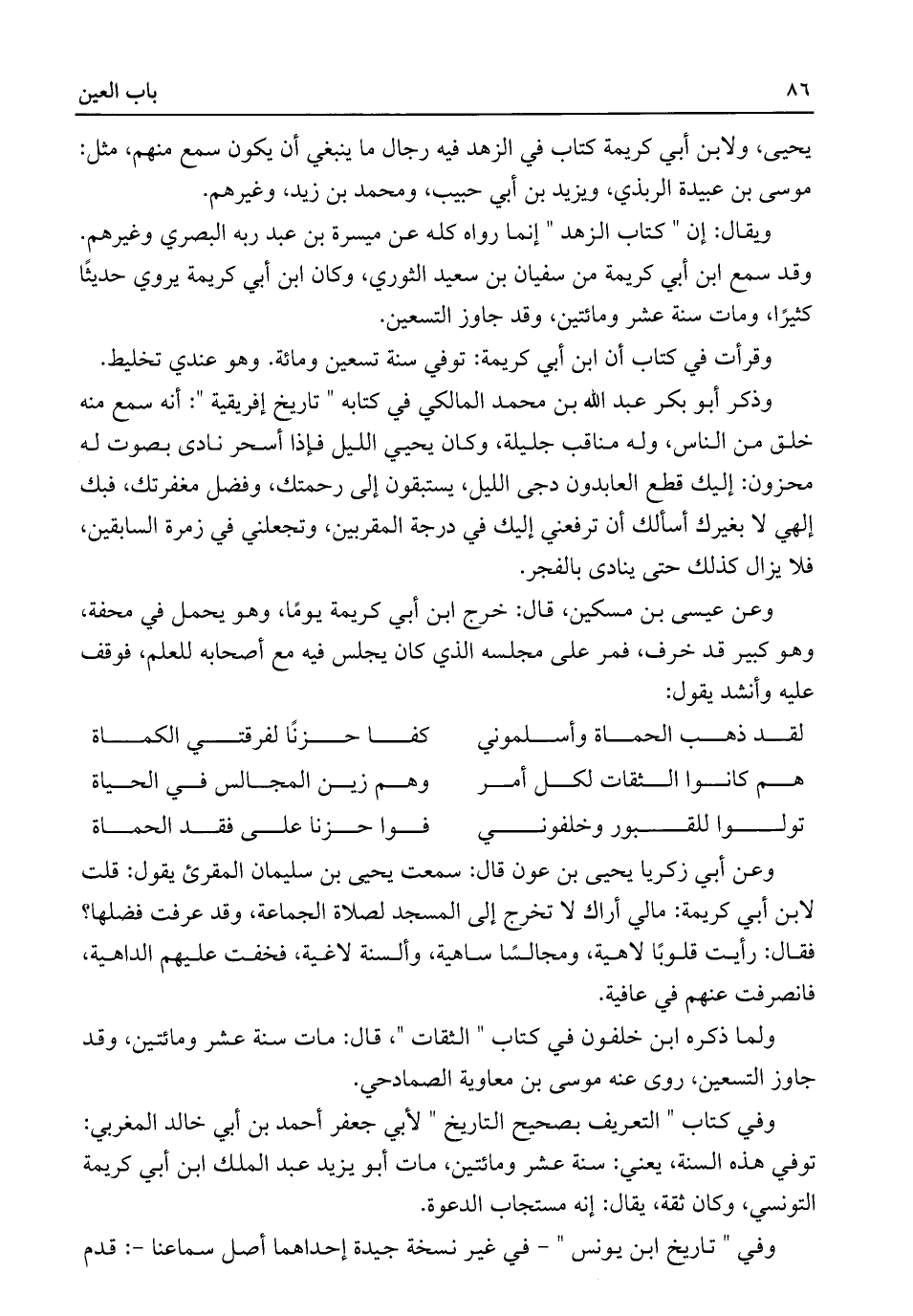 يحيى، ولابن أبي كريمة كتاب في الزهد فيه رجال ما ينبغي أن يكون سمع منهم، مثل: موسى بن عبيدة الربذي، ويزيد بن أبي حبيب، ومحمد بن زيد، وغيرهم.