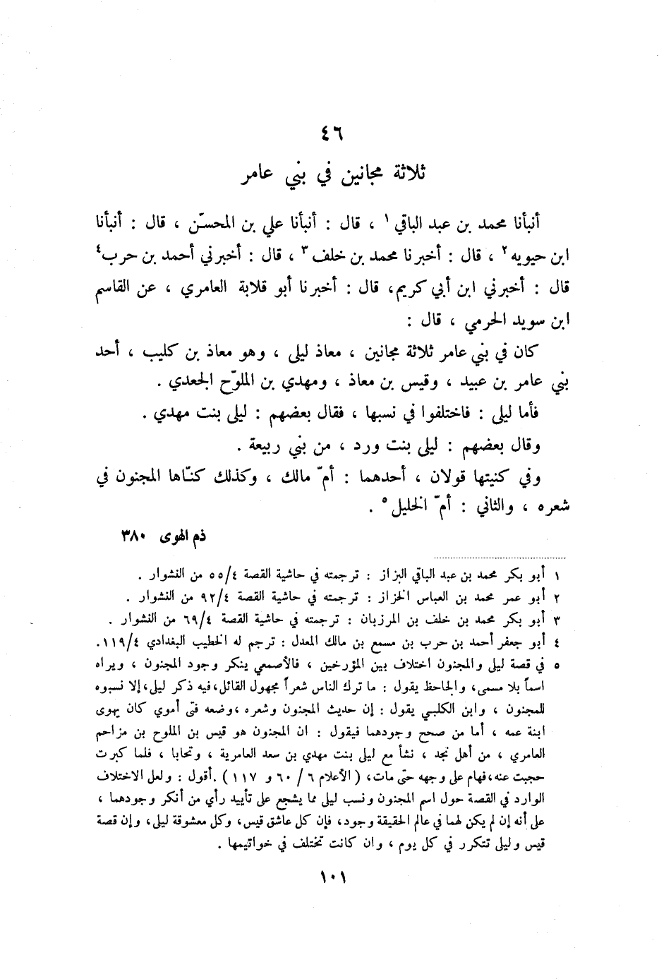 كان في بني عامر ثلاثة مجانين، معاذ ليلى، وهو معاذ بن كليب، أحد بني عامر بن عبيد، وقيس بن معاذ، ومهدي بن الملوّح الجعدي.
