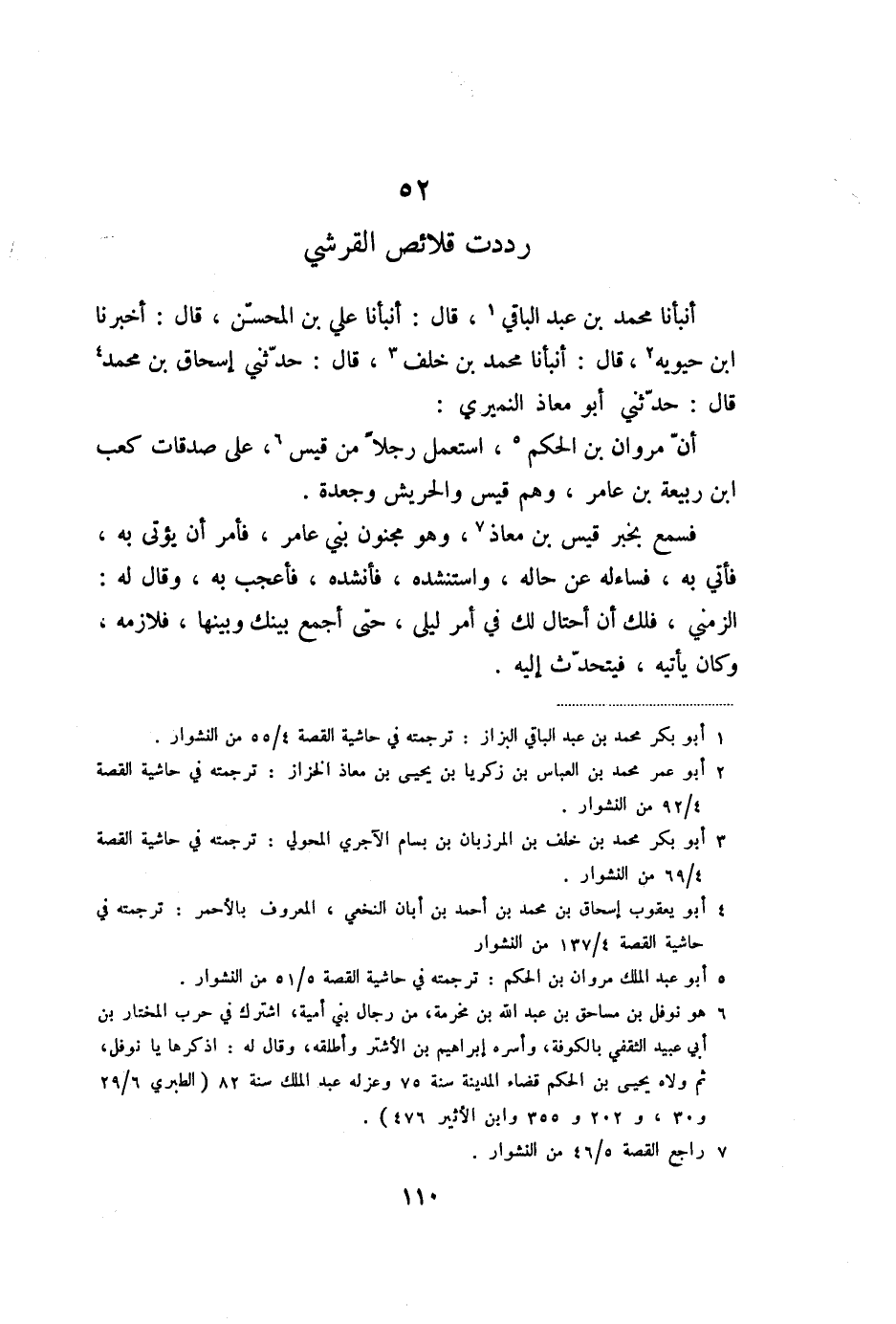 أنبأنا محمد بن عبد الباقي «1» ، قال: أنبأنا علي بن المحسّن، قال: أخبرنا ابن حيويه «2» ، قال: أنبأنا محمد بن خلف «3» ، قال: حدّثني إسحاق بن محمد «4» قال: حدّثني أبو معاذ النميري: