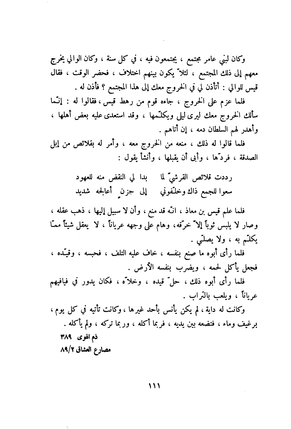 فلما علم قيس بن معاذ، انّه قد منع، وأن لا سبيل إليها، ذهب عقله، وصار لا يلبس ثوبا إلّا خرّقه، وهام على وجهه عريانا، لا يعقل شيئا ممّا يكلّم به، ولا يصلّي.