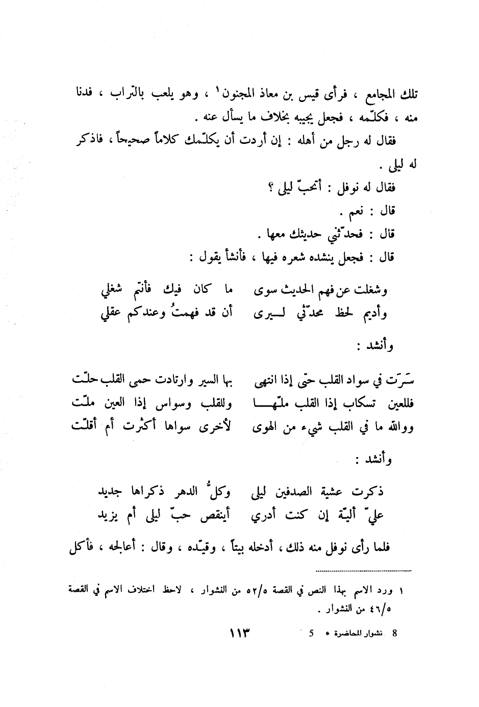 تلك المجامع، فرأى قيس بن معاذ المجنون «1» ، وهو يلعب بالتراب، فدنا منه، فكلّمه، فجعل يجيبه بخلاف ما يسأل عنه.