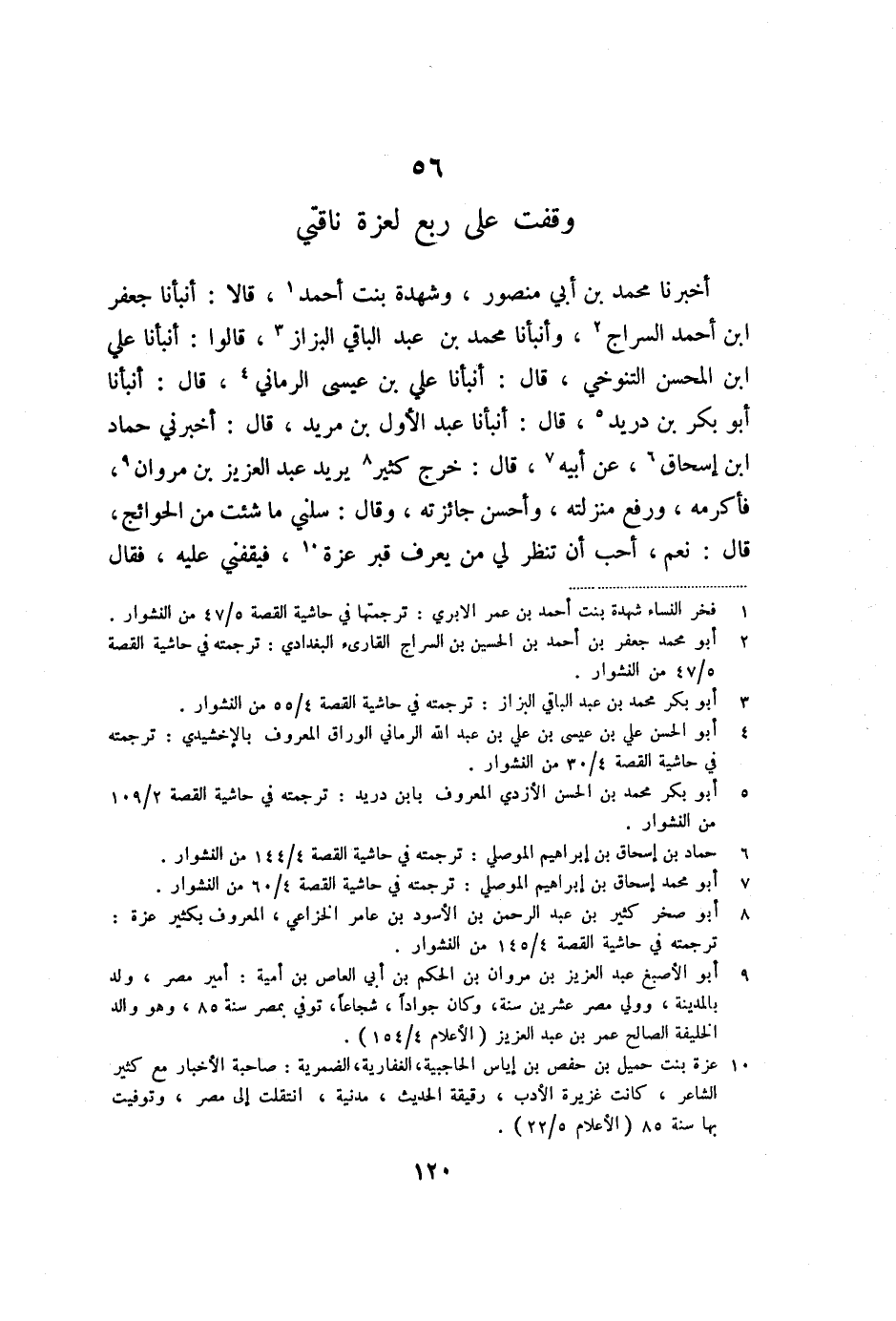 أخبرنا محمد بن أبي منصور، وشهدة بنت أحمد «1» ، قالا: أنبأنا جعفر ابن أحمد السراج «2» ، وأنبأنا محمد بن عبد الباقي البزاز «3» ، قالوا: أنبأنا علي ابن المحسن التنوخي، قال: أنبأنا علي بن عيسى الرماني «4» ، قال: أنبأنا أبو بكر بن دريد «5» ، قال: أنبأنا عبد الأول بن مريد، قال: أخبرني حماد ابن إسحاق «6» ، عن أبيه «7» ، قال: خرج كثير «8» يريد عبد العزيز بن مروان «9» ، فأكرمه، ورفع منزلته، وأحسن جائزته، وقال: سلني ما شئت من الحوائج، قال: نعم، أحب أن تنظر لي من يعرف قبر عزة «10» ، فيقفني عليه، فقال