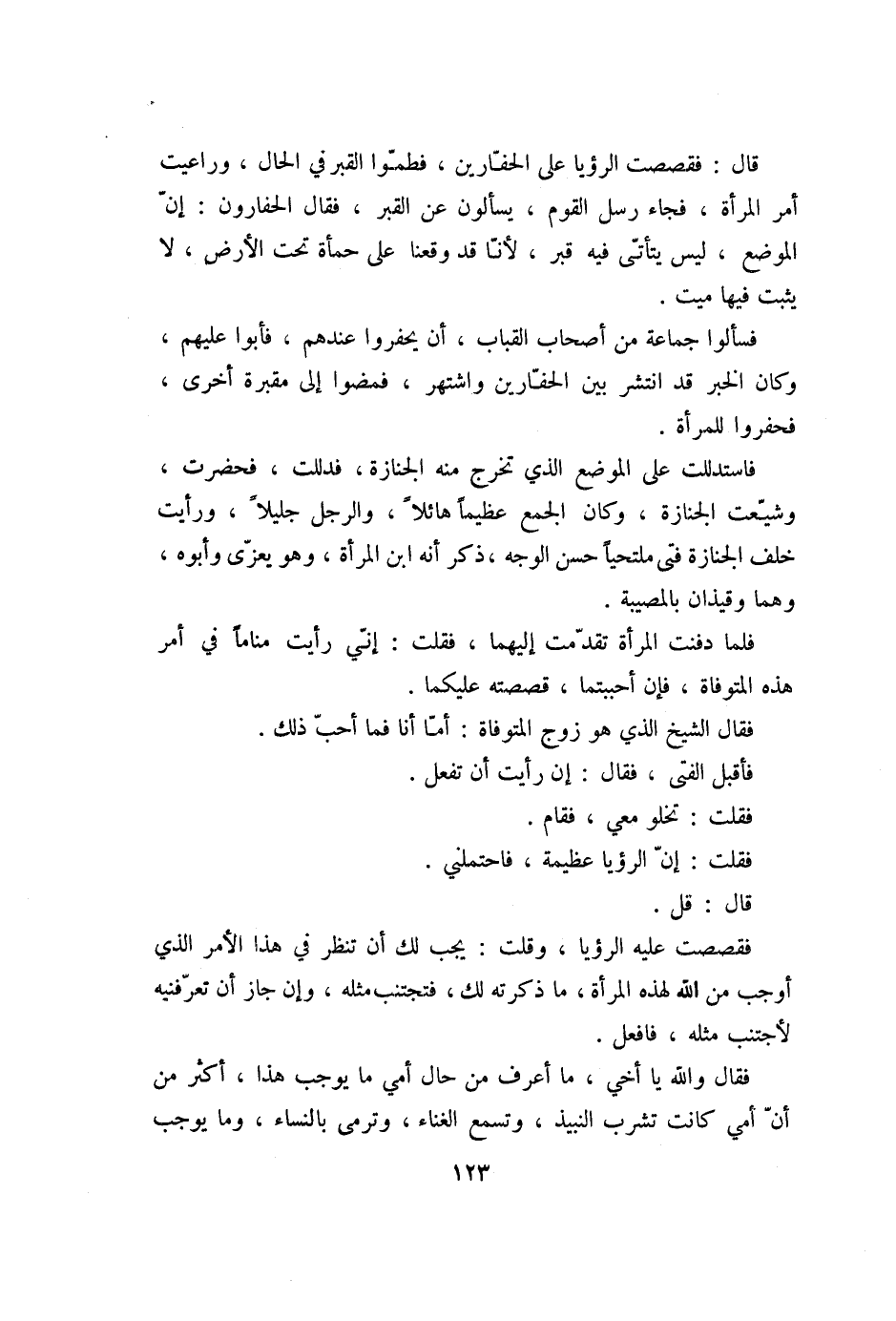 فلما دفنت المرأة تقدّمت إليهما، فقلت: إنّي رأيت مناما في أمر هذه المتوفاة، فإن أحببتما، قصصته عليكما.
