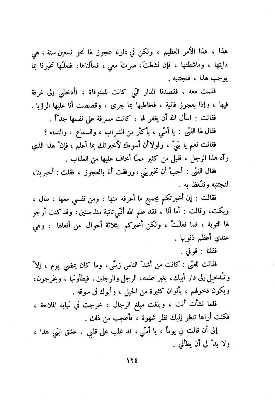 فقال الفتى: أحبّ أن تخبريني، ورفقت أنا بالعجوز، فقلت: أخبرينا، لنجتنبه ونتّعظ به.