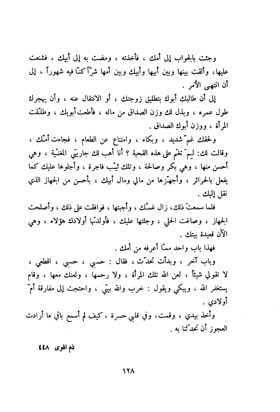 وباب آخر، وبدأت تحدّث، فقال: حسبي، حسبي، اقطعي، لا تقولي شيئا، لعن الله تلك المرأة، ولا رحمها، ولعنك معها، وقام يستغفر الله، ويبكي ويقول: خرب والله بيتي، واحتجت إلى مفارقة أمّ أولادي.