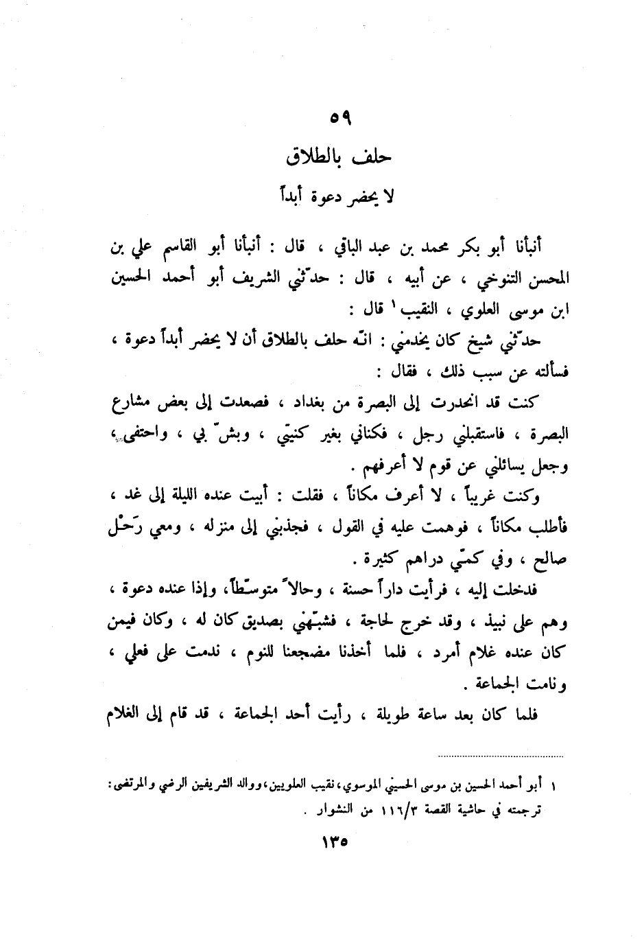 أنبأنا أبو بكر محمد بن عبد الباقي، قال: أنبأنا أبو القاسم علي بن المحسن التنوخي، عن أبيه، قال: حدّثني الشريف أبو أحمد الحسين ابن موسى العلوي، النقيب «1» قال: