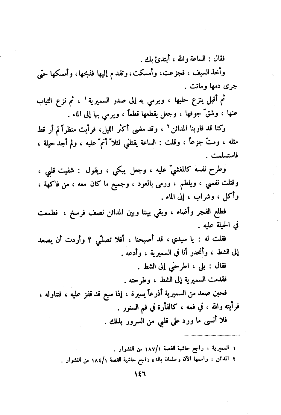 وكنا قد قاربنا المدائن «2» ، وقد مضى أكثر الليل، فرأيت منظرا لم أر قط مثله، ومتّ جزعا، وقلت: الساعة يقتلني لئلّا أنمّ عليه، ولم أجد حيلة، فاستسلمت.