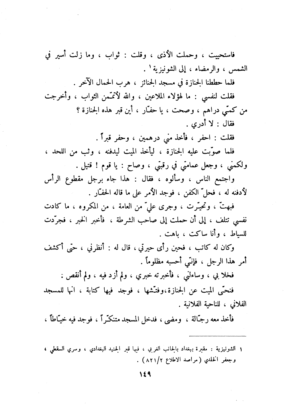 فقلت لنفسي: ما لهؤلاء الملاعين، والله لأتمّمن الثواب، وأخرجت من كمّي دراهم، وصحت، يا حفّار، أين قبر هذه الجنازة؟